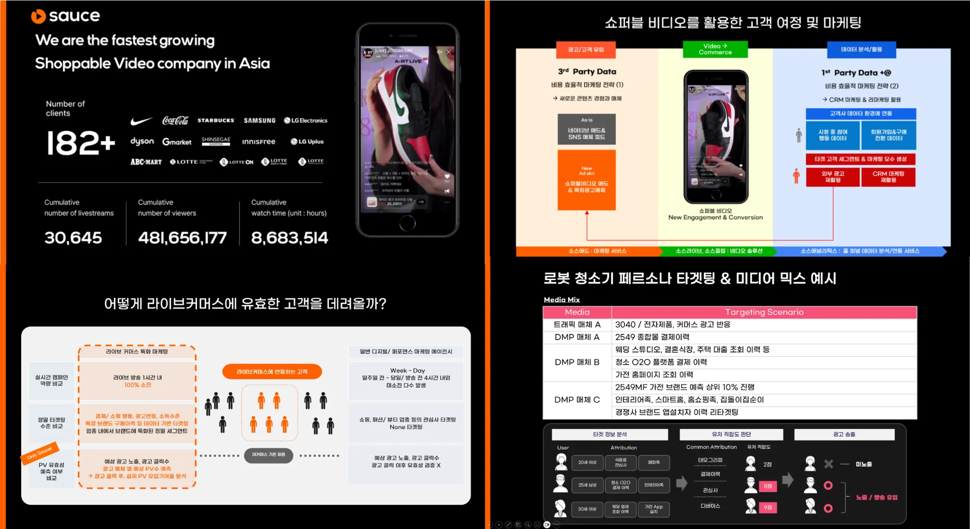 더불어 실시간 라이브 방송 타깃 마케팅 솔루션, '소스애드'를 기반으로 그간 집행한 2,000여 개 캠페인 사례를 통해 방송 목표에 맞춰 달라지는 매체별 미디어믹스 전략을 밝혔습니다.
