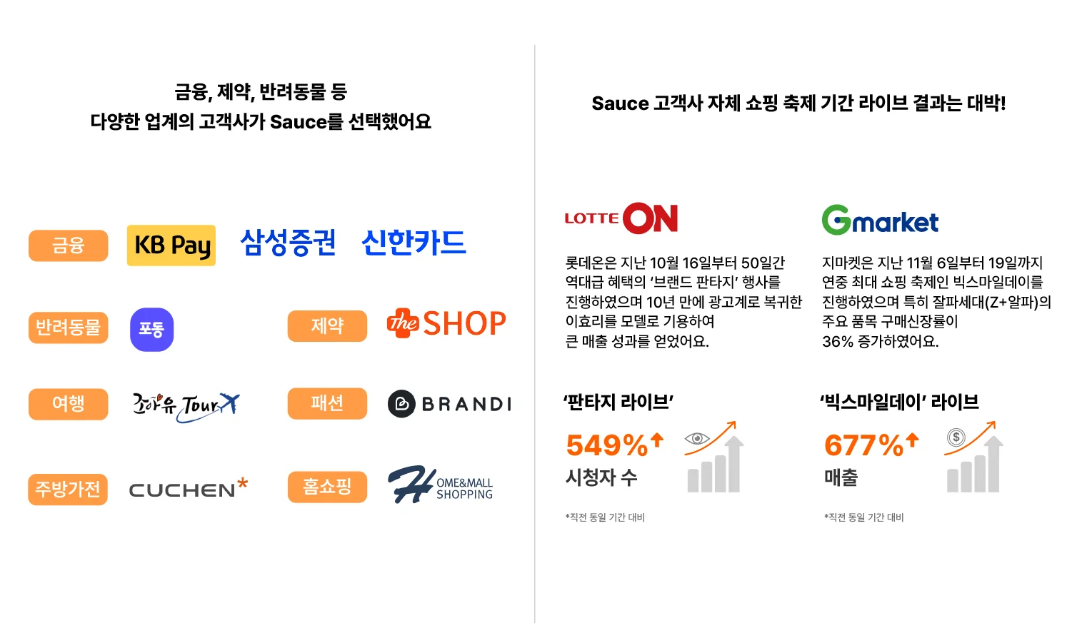 Sauce 주요 고객사 자체 쇼핑 축제 기간 라이브 성과도 매우 높았다. 롯데온이 지난 10월 16일부터 50일간 진행한 '판타지 라이브'는 직전 동일 기간 대비 시청자 수가 약 549% 증가했으며, 지마켓의 빅스마일데이 기간 라이브 매출은 직전 동일 기간 대비 약 677% 증가했다.