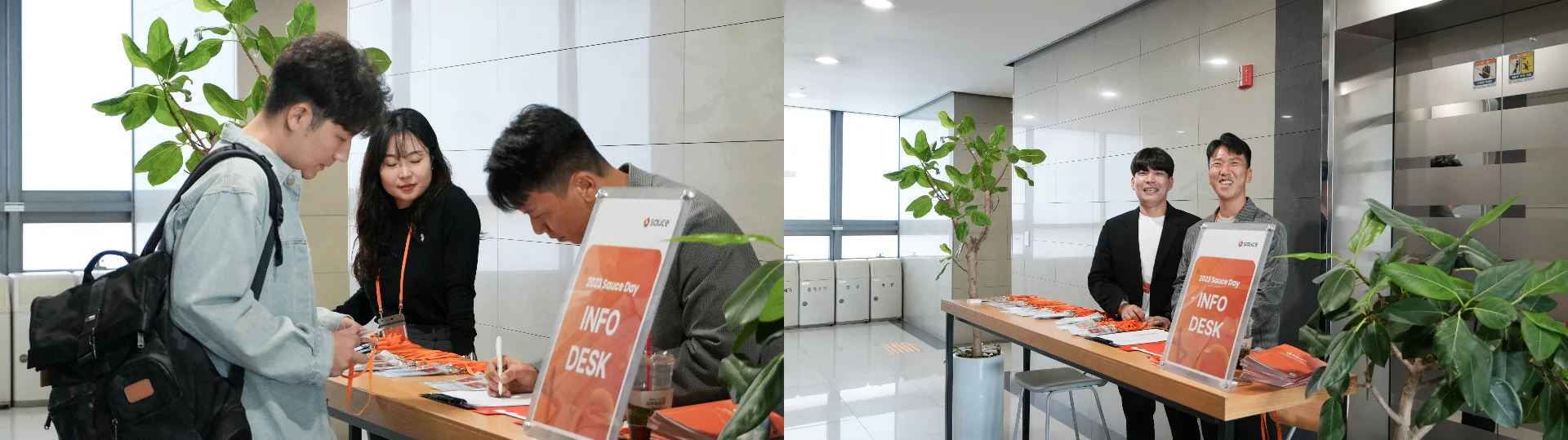 오전 9시 50분, Sauce의 고객사 담당자 분들께서 소스데이 행사장에 도착하셨어요. 인포데스크에는 고객사 담당자분들과 가장 가까이에서 소통하는 Sauce의 세일즈팀 담당자들이 맞이해 주셨는데요. 먼곳까지 직접 찾아와주신 분들과 한분 한분 직접 얼굴을 뵙고 인사를 나누니 훨씬 반갑고 좋은 것 같습니다.