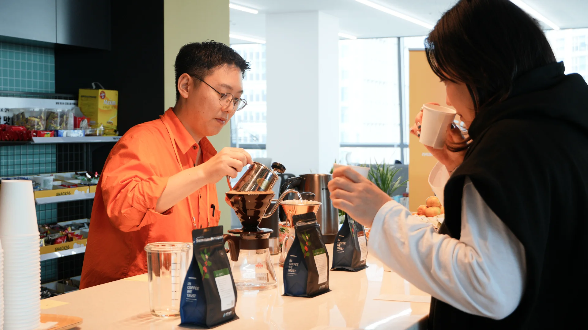 행사장에 일찍 도착하면 약간 어색하잖아요. 행사 참여자 분들의 어색함을 방지하고자 Sauce팀 이제우님께서 핸드드립 커피 이벤트를 준비했어요. 제우님은 인게이지먼트 스쿼드에서 기획자로서 Sauce를 더욱 좋은 서비스로 만들어주시는 능력자일 뿐만 아니라 바리스타 자격증을 보유한 Sauce 공식 바리스타이시기도 한데요. 일찍 도착하신 분들은 다양한 핸드드립 커피를 마시며 여유롭고 향긋한 시간을 보냈습니다.