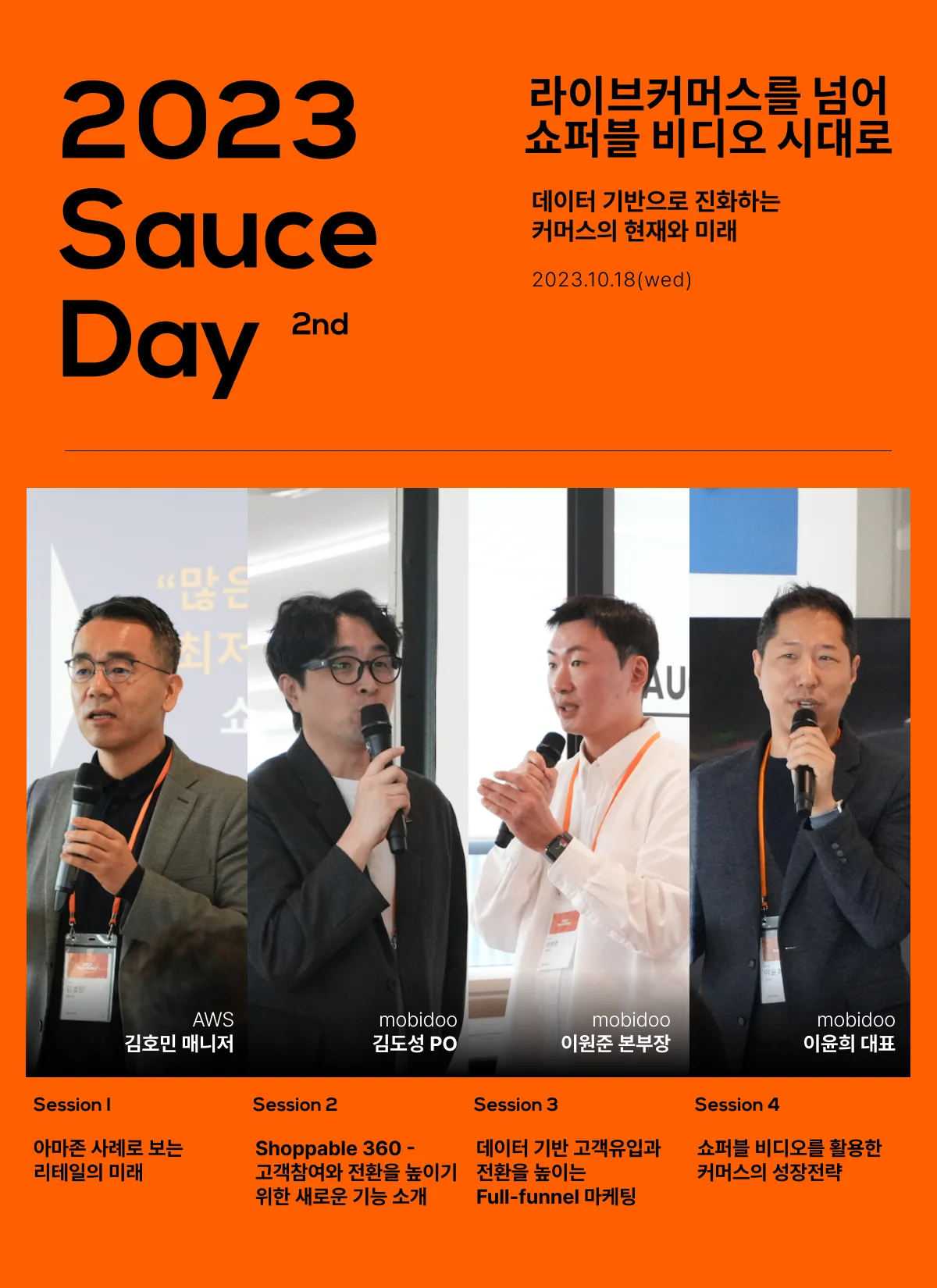 소스데이는 Sauce의 고객사 분들과 함께 라이브커머스 트렌드와 정보를 나누는 행사로, 올해는 삼성전자, 지마켓, LG유플러스, 신세계라이브쇼핑, 롯데면세점 등 라이브커머스 솔루션 Sauce를 이용하고 계신 다양한 분야의 파트너 분들을 모시고 ‘라이브커머스를 넘어 쇼퍼블 비디오의 시대로! - 데이터 기반으로 진화하는 커머스의 현재와 미래’라는 주제로 진행되었습니다.