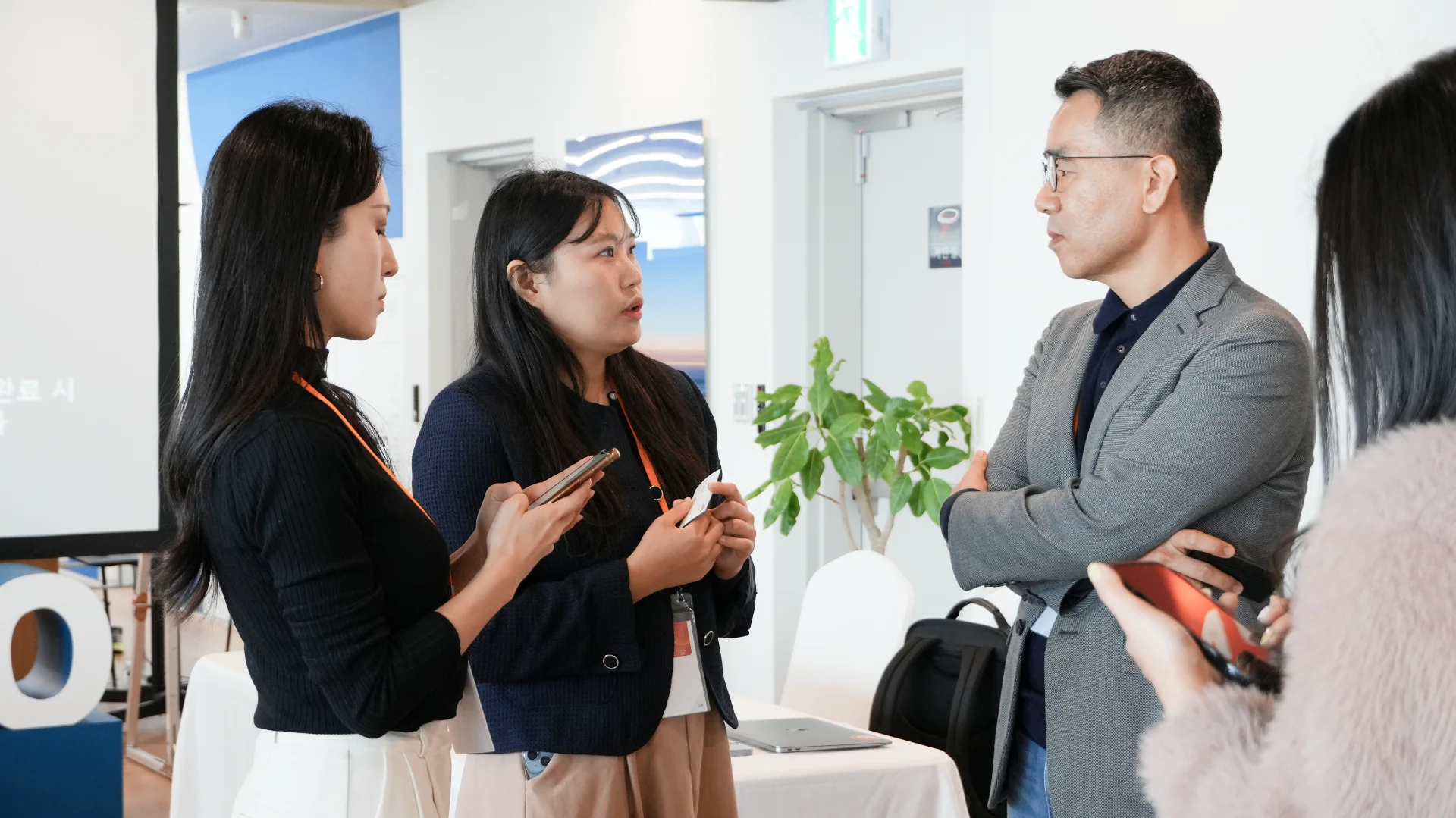 잠시 후, 고객사 담당자 분들이 모두 행사장에 도착하셨어요. 서로 명함을 주고받으며 가볍게 아이스브레이킹을 하고 네트워킹을 하는 시간을 가졌는데요. 특히 고객사와 전화나 온라인으로 자주 소통을 하던 ‘소스애드’팀도 소스데이에 참석하여 한분 한분 직접 인사를 나누는 자리를 가졌습니다.