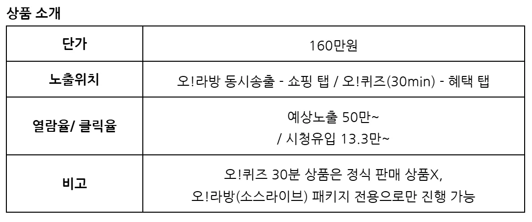 - 오!라방 동시송출x오!퀴즈(30min) PKG ‘160만원’ (오!라방 판매가 160만원 / 오!퀴즈 판매가 150만원)