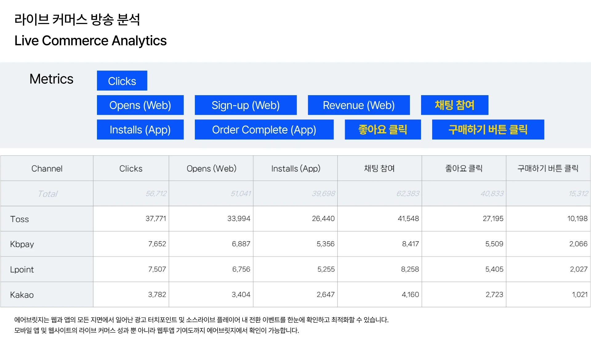 라이브 커머스 솔루션 소스라이브와 마케팅 성과 측정 솔루션(MMP : 모바일 측정 파트너, Mobile Measurement Partner) 에어브릿지가 연동돼 이제 소스라이브를 통한 구매 전환 기여 분석 외 40여 종의 라이브 방송 플레이어 내 고객의 시청 행동 데이터까지 활용할 수 있게 되었다는 소식을 알려드립니다.