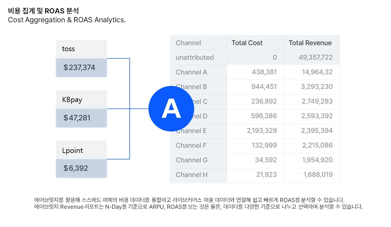 소스애널리틱스는 매체별 기여 분석에 따른 효율적인 ROAS 관리는 물론, 유입된 유저가 최종적으로 구매 전환을 일으켰는가에 대한 기여 분석까지 커버가 가능하게 되었습니다. 바로 소스라이브와 에어브릿지의 연동 덕분이죠.