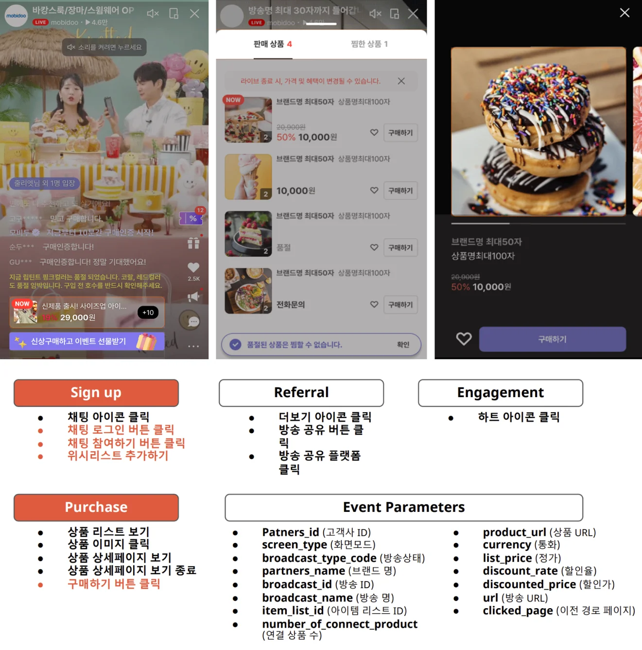 B사의 예를 들어보겠습니다. 브랜드 B사는 라이브 커머스를 매출을 일으키기 위한 액션 외에도 1회의 라이브 방송을 진행하면 방송 이후 4-500여 명의 신규 가입자(Installation)를 확보하게 된다고 합니다. 이때 회원가입 전환의 마케팅 터치 포인트는 ‘채팅 로그인 버튼 클릭’ 이벤트가 됩니다. 채팅 로그인 버튼 클릭 후 자사 몰의 회원가입 페이지로 유입되기 때문이죠. 라이브 시청자가 채팅 로그인 버튼을 클릭하는 이유는 브랜드사가 진행하는 라이브에서 제공하는 리워드 혜택을 받기 위해 채팅에 참여하려면 회원가입이 필수라는 배경이 있기 때문인데요.