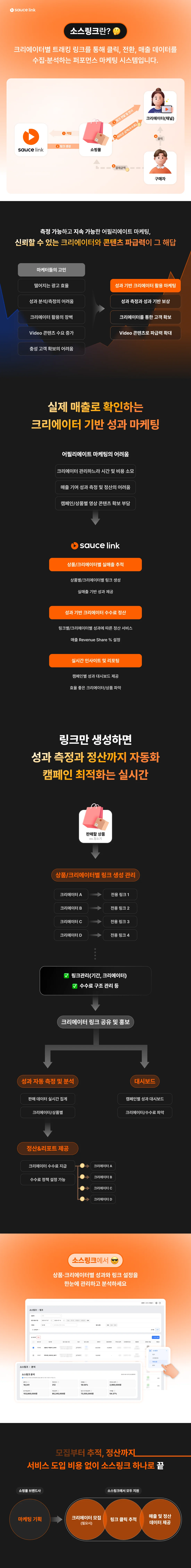 소스링크는 크리에이터 기반 어필리에이트 마케팅 SaaS 솔루션으로 크리에이터 모집부터 링크 생성, 운영, 성과 측정, 정산까지 풀퍼널 원스톱 관리가 가능합니다.
