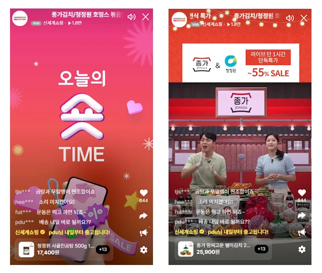 ‘종가김치/청정원 호밍스 볶음밥 외 간편식 특가’ 라이브 중 약 46분 시점에 쇼호스트가 “오늘의 숏타임”을 외치는 순간, 위 이미지 중 왼쪽에 해당하는 홍보 이미지가 나타납니다. 바로 이 타이밍이 쇼킷과 약속한 숏폼 추출 시작 지점입니다. 이 순간부터 쇼호스트는 제품을 하나하나 다시 한번 꼼꼼하게 설명하고, 직접 상품을 시식하며 ASMR을 들려주는 등 숏폼에 맞는 장면을 연출합니다. 1분 ~ 1분 30초가 지났을 무렵 쇼호스트가 종료 멘트와 함께 다시 한번 홍보 이미지가 나타나면, 이 타이밍이 쇼킷과 약속한 숏폼 추출 종료 시점입니다.