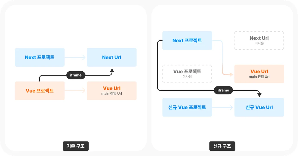 마이그레이션이 거의 끝나갈 때쯤, 프로젝트 구성 요소의 변경이 필요해졌습니다. 기존에는 Vue 기반 프레임워크를 루트로 하여, 그 내부에 각 Next.js 페이지들을 iframe으로 연결해 QA를 병행하는 구조였지만, 마이그레이션이 어느 정도 완료된 시점에서는 Next.js를 메인 엔트리로 삼고, 필요한 Vue 페이지만을 iframe 형태로 포함하는 방식으로 구조를 변경한 후 검증을 진행할 필요가 있었습니다.