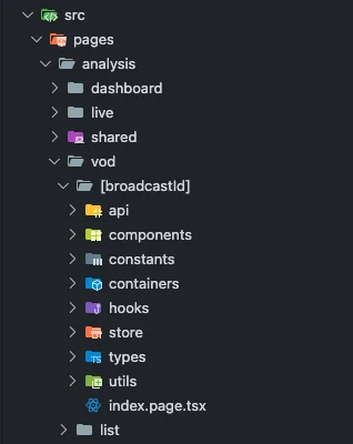 Next.js로의 마이그레이션은 프로젝트 구조 자체를 근본적으로 혁신하는 계기가 되었습니다. Next.js의 파일 기반 라우팅과 폴더 구조 컨벤션을 받아들이면서, 프론트엔드 팀은 기존에 혼재되어 있던 코드들을 기능과 역할별로 명확히 분리하여 재배치했습니다.
